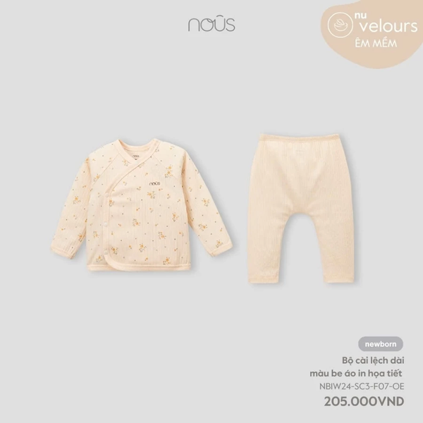 Bộ cài lệch dài màu be áo in hoạ tiết NB